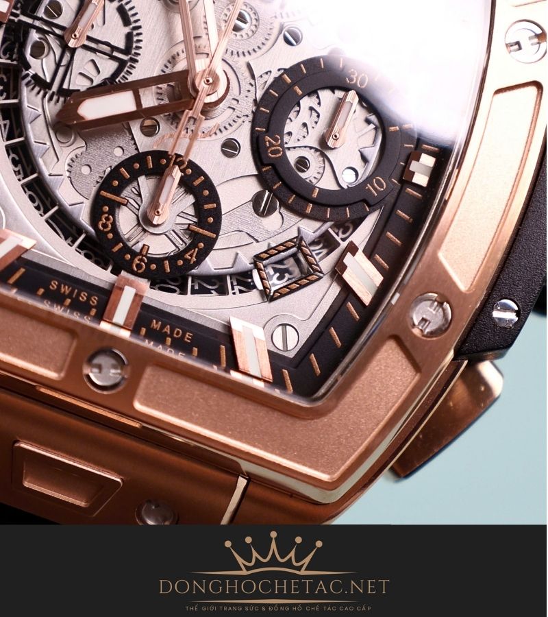 Thiết kế: Tái hiện 99% bản gốc, từ vỏ vàng hồng rực rỡ, mặt số đen sâu thẳm, đến vít chữ H và logo Hublot được chế tác sắc nét.
