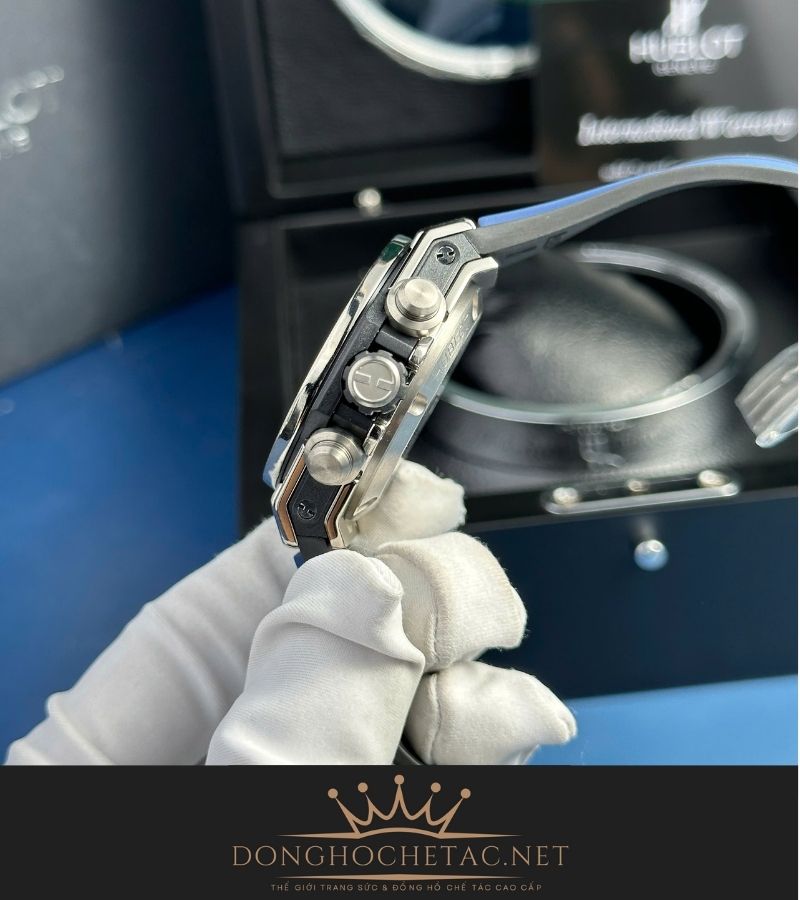 Thiết kế: Tái hiện 99% bản gốc, từ vỏ titan, mặt số xanh chronograph, đến vít chữ H và logo Hublot được chế tác sắc nét.