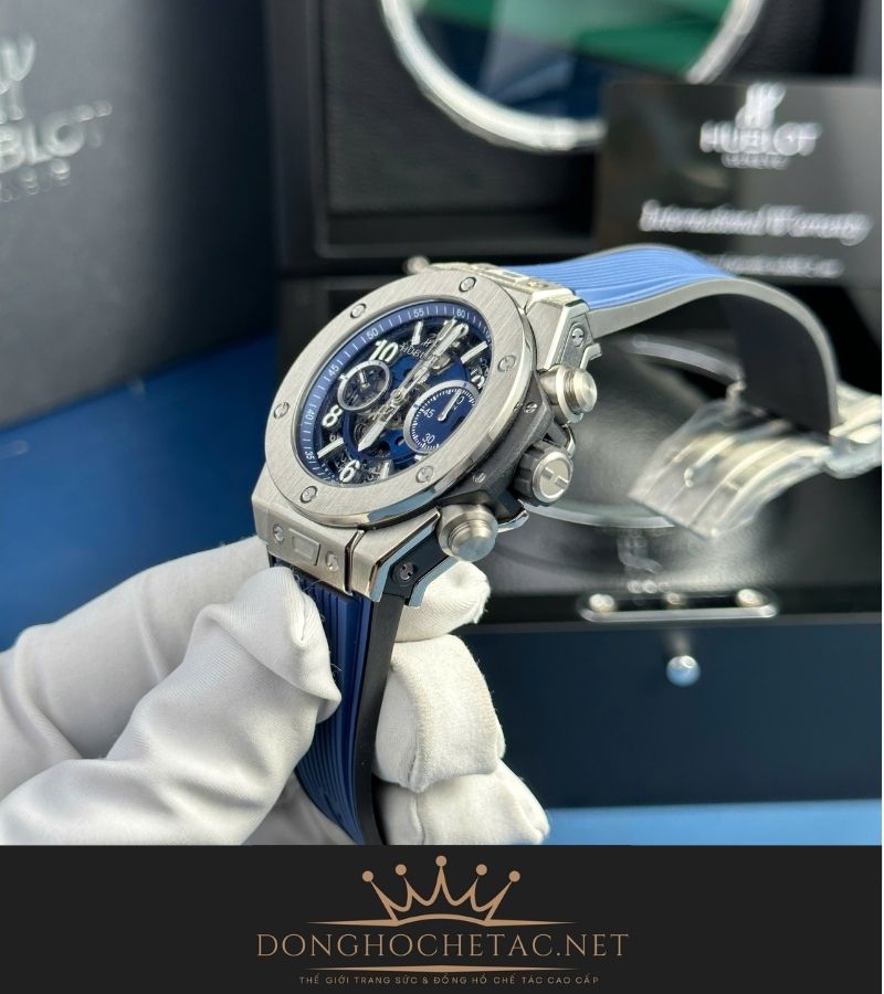 Dây đeo: Cao su xanh dương cao cấp với họa tiết vân nổi, kết hợp khóa gập Hublot khắc logo.