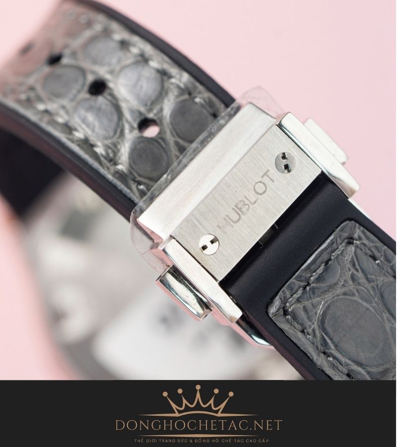 Dây đeo: Da cá sấu xám cao cấp, kết hợp khóa gập Hublot khắc logo.