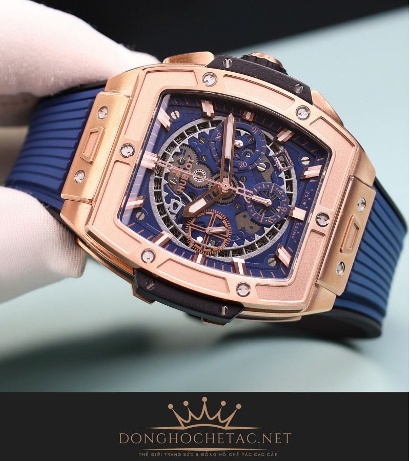 Thiết kế: Tái hiện 99% bản gốc, từ vỏ vàng hồng rực rỡ, mặt số xanh dương sâu thẳm, đến vít chữ H và logo Hublot được chế tác sắc nét.