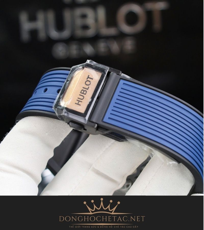 Dây đeo: Cao su đen hoặc vàng hồng bọc thép, kết hợp khóa gập Hublot khắc logo.