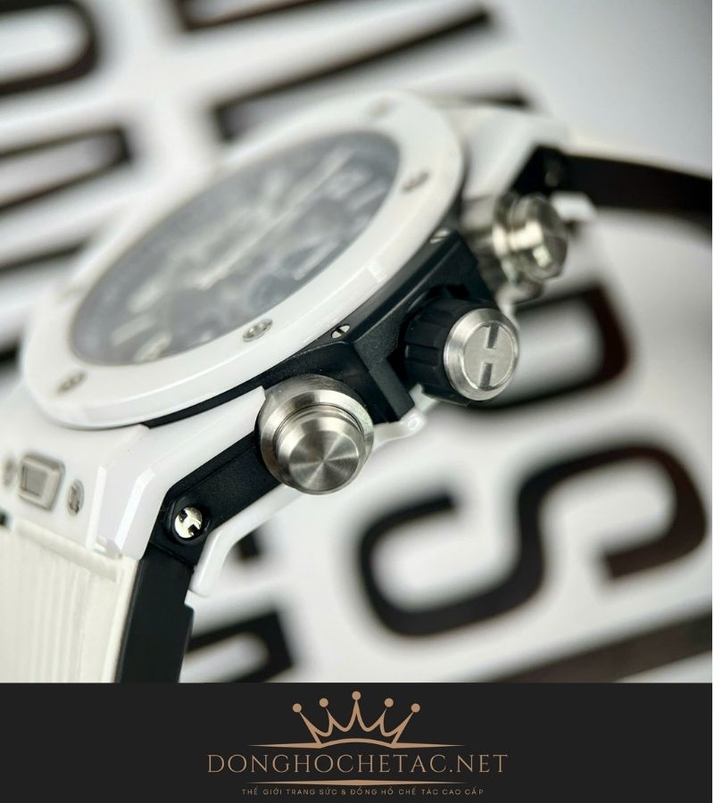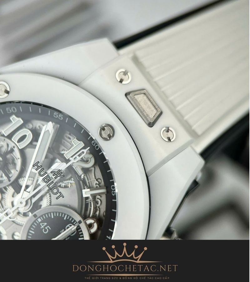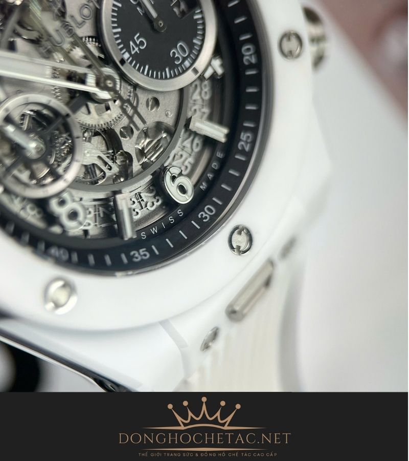 Với đường kính 44mm, Hublot Big Bang Unico White Ceramic mang đến cảm giác mạnh mẽ và năng động. Thiết kế này phù hợp với những ai yêu thích phong cách thể thao nhưng vẫn muốn giữ được nét tinh tế. Vành bezel với các ốc vít hình chữ “H” đặc trưng của Hublot là điểm nhấn độc đáo, tạo nên vẻ đẹp khó nhầm lẫn.