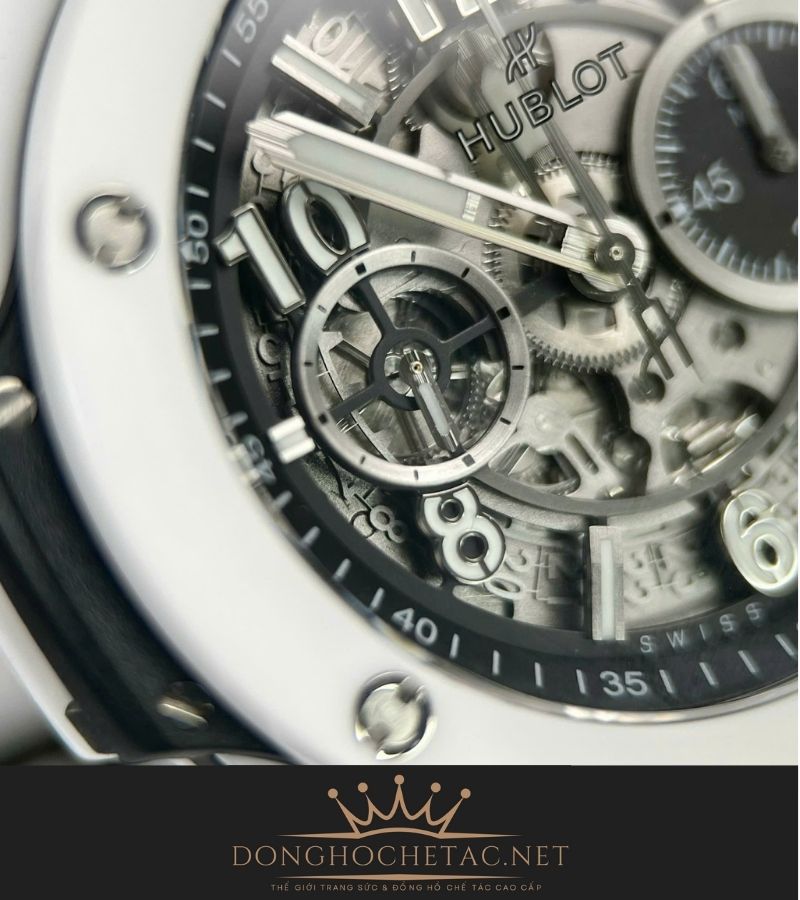 Một trong những đặc điểm nổi bật nhất của Hublot Big Bang Unico White Ceramic là mặt số lộ cơ, cho phép người đeo quan sát hoạt động của bộ máy bên trong.